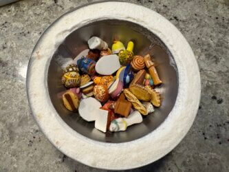 • DOME 16cm: Verser 400g de mousse litchi dans la demi-sphère de 16cm de diamètre. Placer au centre le dôme de 12cm et appuyer dessus ou mettre un poids dedans pour maintenir (fèves en céramique sur la photo). Congeler 2 heures. Puis enlever le petit dôme avec les fèves. Mettre de l'eau chaude dedans pendant 1 minute pour démouler.